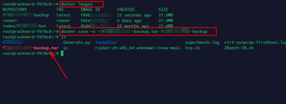 使用docker images命令列出所有镜像文件,然后打包刚刚生成的备份镜像文件。